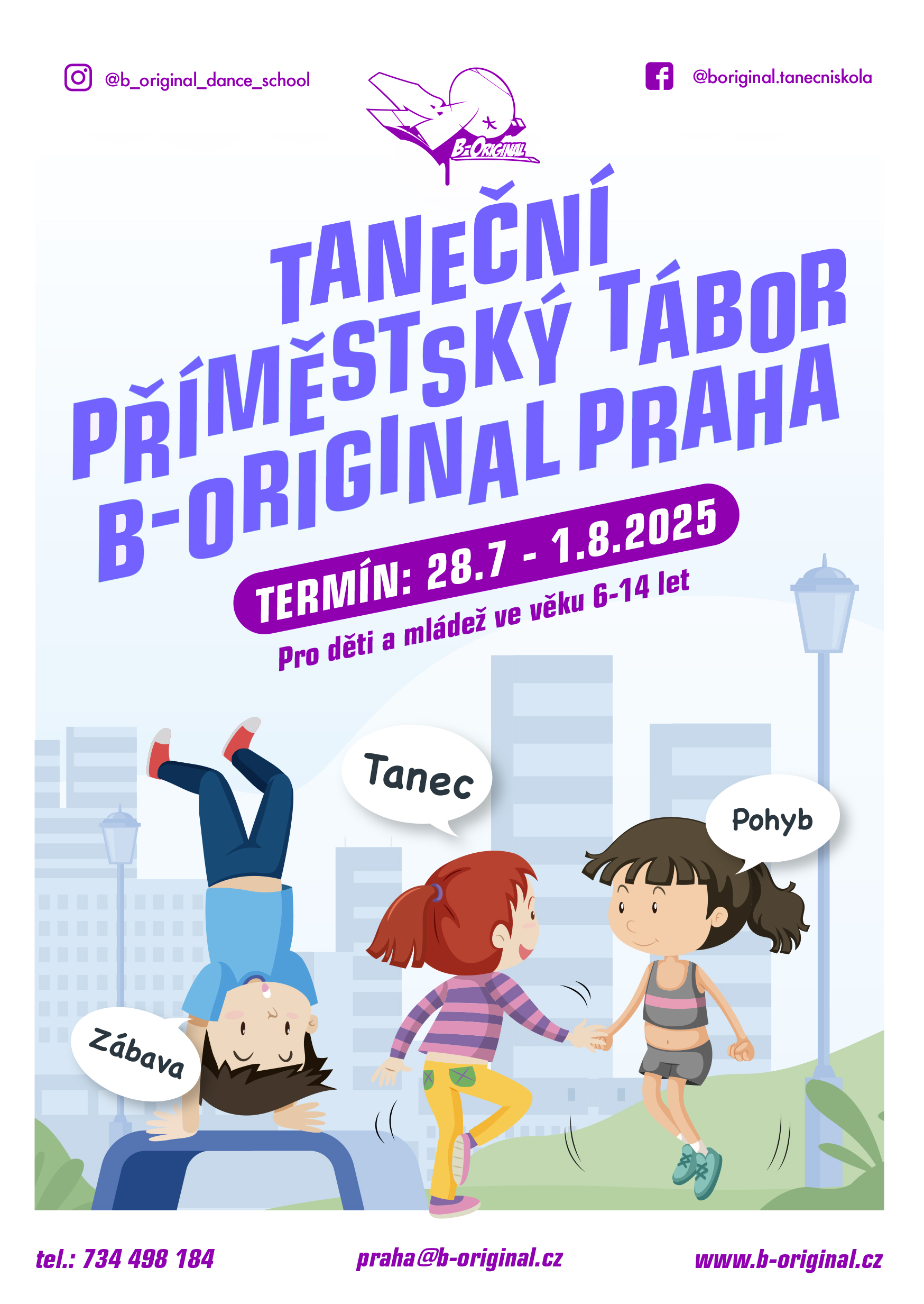Děti si vyzkouší různé taneční styly. Mohou těšit na taneční styly jako je hip hop, dancehall, lockin a spousty dalších. Další náplní tábora budou samozřejmě hry a tvořivá činnost.Děti nemine ani výlet – místo bude upřesněno (příplatek 200,- Kč).